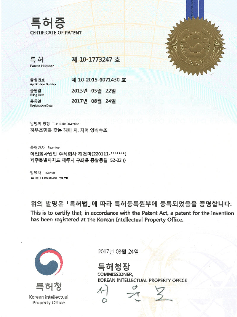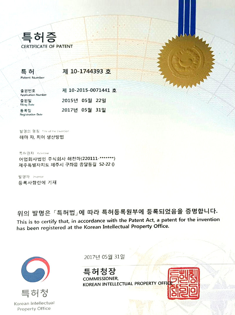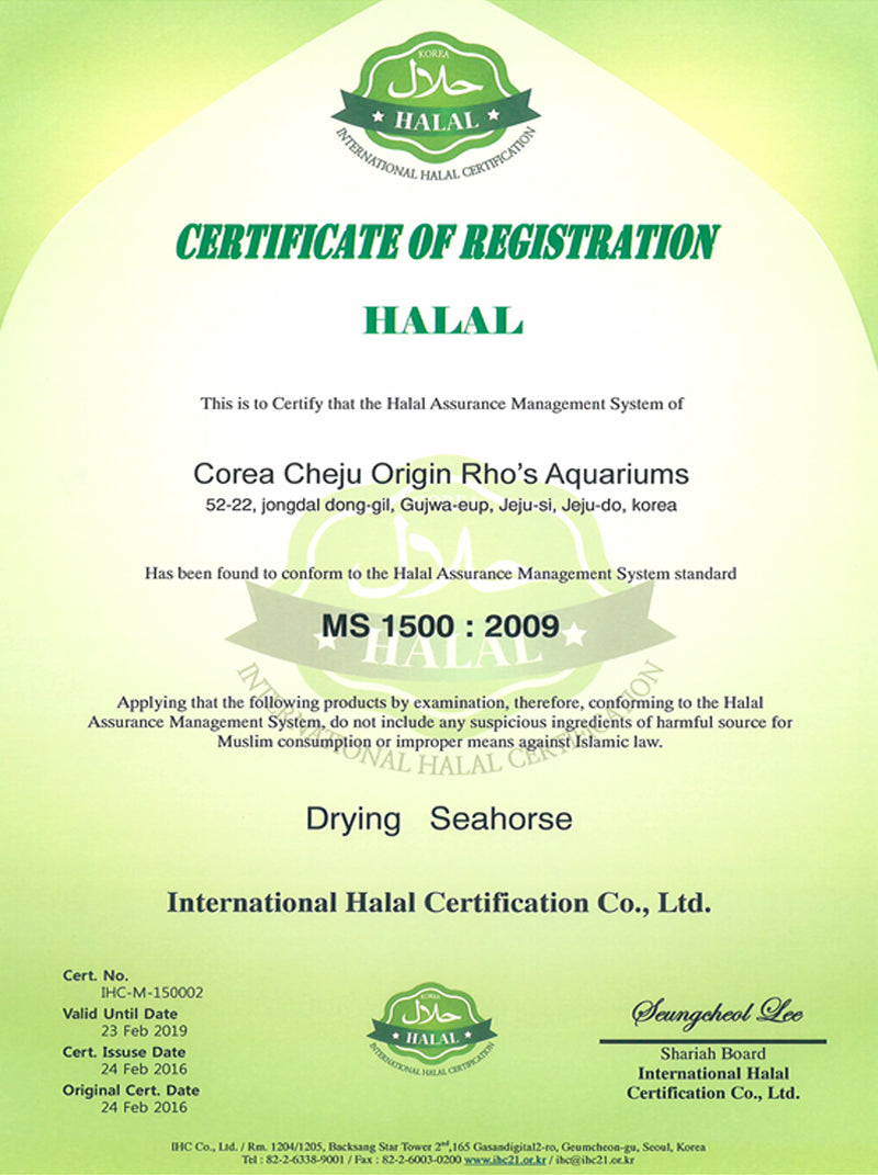 The seahorse produced by HAECHUNMA is a classic representation of Jeju’s specialized aquaculture industry. A hygienic food source with absolutely no drugs, such as antibiotics etc. which are harmful to the human body, used in the entire breeding process. At HAECHUNMA CO. LTD, they comply strictly to the standardization regarding seahorses so as to effectively bring out the efficacy of the seahorse.